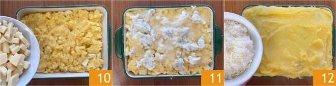 Forme outra camada de polenta e adicione os cubos de fontina 10, depois cubra com uma terceira camada de polenta e recheie com o gorgonzola 11. Complete com uma última camada de polenta e o Grana Padano DOP ralado 12.