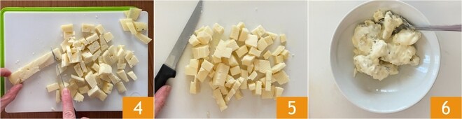 Enquanto isso, corte em cubos o asiago 4, a fontina 5 e o gorgonzola 6, depois rale o Grana Padano DOP.