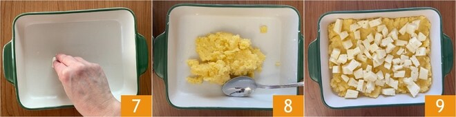 Unte bem uma assadeira de cerca de 23x17 cm 7, cubra a base com uma parte da polenta 8 e distribua os cubos de Asiago 9.