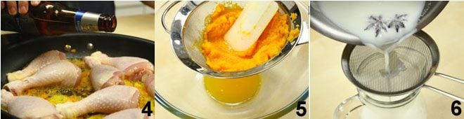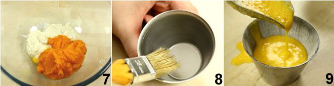 Misture o purê de cenoura com o bechamel 7, então incorpore também os ovos inteiros e as duas gemas e misture tudo. Unte e enfarinhe 4 forminhas 8, despeje o composto nelas 9 e asse no forno a 160 °C por 60 minutos. Finalmente, sirva o prato colocando o frango sobre um leito de verduras, polvilhe com o caldo de cozimento e sirva acompanhado da tortinha de cenoura.