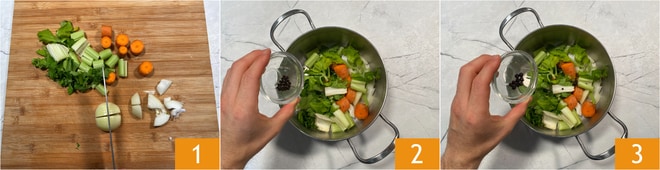 Para preparar o frango no vapor com molho tártaro, comece pelos legumes: limpe a cebola e o aipo, depois corte a cenoura e tudo em pedaços pequenos (também o talo do aipo) 1. Coloque os legumes em uma panela grande com pimenta 2 e bagas de zimbro 3.