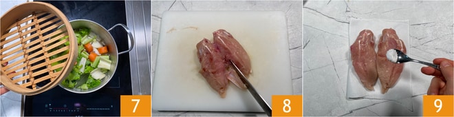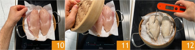 Cubra com o cesto da panela a vapor 7 e acenda o fogão. Enquanto isso, limpe o peito de frango removendo ossos, cartilagem e fibras 8. Salgue a superfície de ambos os lados 9.
