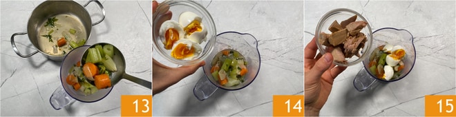 Quando o frango estiver cozido, deixe esfriar e escorra os legumes no copo do liquidificador com um pouco de água 13; o restante pode ser adicionado posteriormente para ajustar a consistência. Adicione os ovos cozidos 14 e o atum 15.