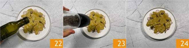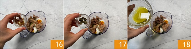 Adicione também as anchovas 16, as alcaparras 17 e o óleo 18.