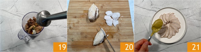 Bata até obter um creme espesso e homogêneo 19. Neste ponto, corte o peito de frango em fatias finas 20 e sirva com o molho tártaro 21.