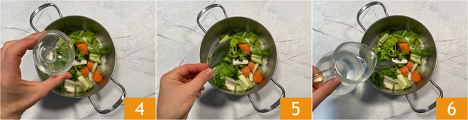Adicione também os cravos-da-índia 4, as folhas de louro 5 e a água 6.