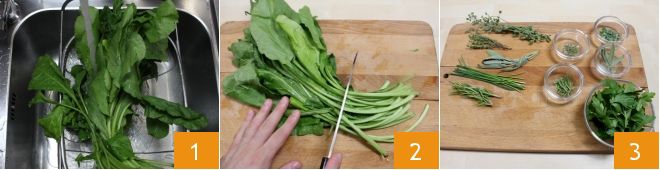 Para preparar o frango ao verde, comece limpando as acelgas: lave-as em água corrente 1 e coloque-as em uma tábua de corte, em seguida, elimine os talos 2. Depois, retire as folhas de todas as ervas aromáticas e transfira para tigelinhas 3.
