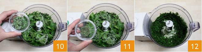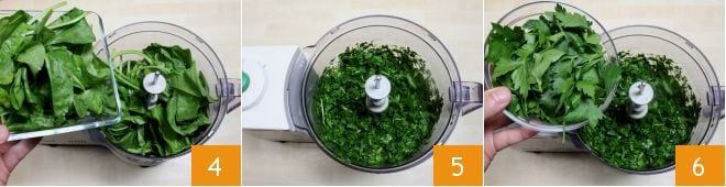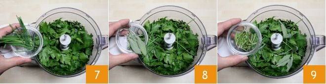 Coloque as acelgas limpas em um processador 4 e triture até picá-las finamente 5. Agora adicione as várias ervas aromáticas, começando pela salsa 6.