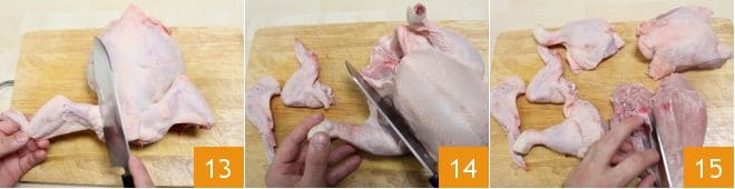 Agora prossiga com a limpeza e corte do frango: coloque o frango inteiro em uma tábua de corte e comece cortando as asas 13, prossiga separando as coxas 14 e, por fim, divida e desosse o peito, certificando-se de ter retirado o osso em forma de Y e outros pedaços de cartilagem 15. Você também pode usar o frango já cortado e desossado que encontra no supermercado.