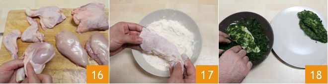 Retire a pele dos diversos pedaços de frango que você cortou 16 e depois enfarinhe-os 17. Depois de enfarinhados, pegue o picadinho de acelga e ervas aromáticas que você havia reservado e passe os pedaços de frango até empaná-los de ambos os lados 18.