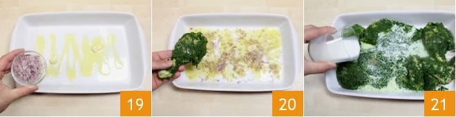 Despeje um fio de óleo em uma assadeira grande e coloque um dente de alho descascado cortado ao meio e adicione a cebola que você picou finamente anteriormente 19. Agora coloque os pedaços de frango enfarinhados e empanados na assadeira 20 e regue-os com o leite para amaciá-los e não deixá-los secar durante o cozimento 21. Você pode substituir o leite por caldo de legumes, descubra como prepará-lo consultando nossa Escola de Culinária: Caldo de legumes.
