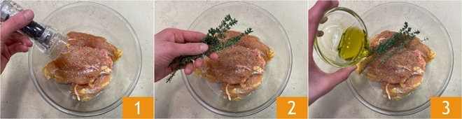 Para preparar o frango com couve-flor e molho de mostarda, primeiro tempere a carne: coloque os peitos de frango em uma tigela e adicione sal, pimenta 1, os ramos de tomilho 2 e o óleo 3.