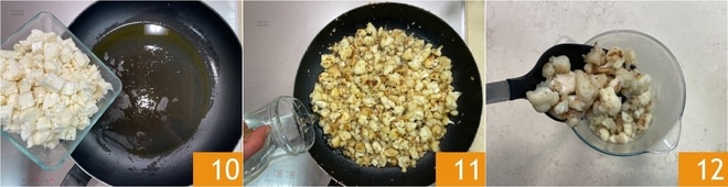 Na mesma frigideira, aqueça outro fio de óleo e adicione a couve-flor picada grosseiramente 10. Salgue, apimente e refogue em fogo médio tomando cuidado para não queimar. Quando estiver dourado, cubra com água 11 e continue cozinhando por 5-6 minutos, até que se desfaça. Neste ponto, transfira a couve-flor para um recipiente 12.