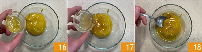 Mantenha o creme de couve-flor quente e passe para o molho de mostarda: em uma tigelinha, misture a mostarda, o mel 16, o vinagre de maçã 17, o óleo e uma pitada de sal. Emulsione bem a mistura 18 e reserve.