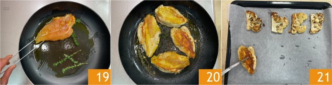 Agora, recupere os peitos de frango: despeje o óleo da marinada em uma frigideira junto com os ramos de tomilho, depois coloque os peitos de frango com a pele voltada para baixo 19 e cozinhe em fogo médio-alto por 4-5 minutos, ou até que fiquem bem dourados e crocantes. Vire os peitos de frango e cozinhe por mais alguns minutos do outro lado 20. Quando estiverem prontos, transfira os peitos de frango para a assadeira onde você colocou as fatias de couve-flor 21.