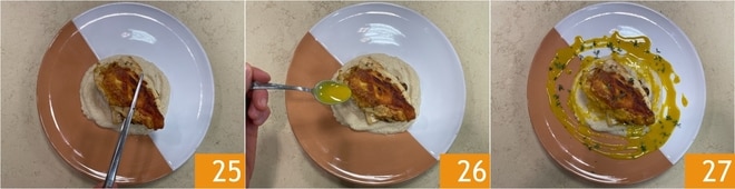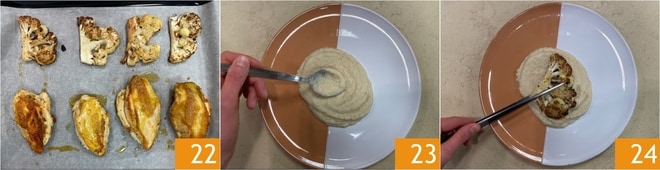 Coloque tudo no forno em modo ventilado a 200° por 5 minutos 22. Você está pronto para empratar: espalhe o creme de couve-flor na base do prato 23, depois adicione uma fatia de couve-flor assada 24.
