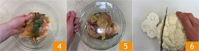Massageie a carne com as mãos para temperá-la uniformemente 4, depois cubra com filme plástico 5 e deixe marinar na geladeira por 30 minutos. Enquanto isso, corte do couve-flor inteiro 4 fatias com cerca de 1 cm de espessura 6. Pique grosseiramente o restante da couve-flor e reserve, você vai usá-lo para fazer o creme.