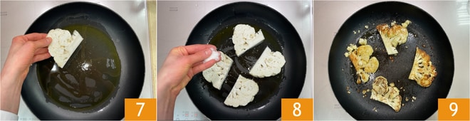 Aqueça um fio de óleo em uma frigideira antiaderente, em seguida, adicione as fatias de couve-flor 7, salgue 8 e apimente. Cozinhe em fogo alto até dourar (vai levar alguns minutos), depois vire as fatias, salgue e apimente novamente e doure o outro lado também 9. Transfira as fatias de couve-flor para uma assadeira forrada com papel manteiga e reserve.