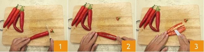 Para preparar o frango piri piri, comece pelas pimentas. Lave as pimentas em água corrente, seque-as com um pano de cozinha e coloque-as em uma tábua de cortar. Corte a extremidade com uma faca pequena, removendo o caule 1, depois divida cada pimenta ao meio no sentido do comprimento 2. Finalmente, esvazie a parte interna usando a faca pequena para remover as sementes 3.