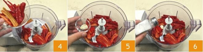 Transfira as pimentas cortadas e limpas para um processador 4, adicione um dente de alho inteiro descascado 5 e sal a gosto 6.