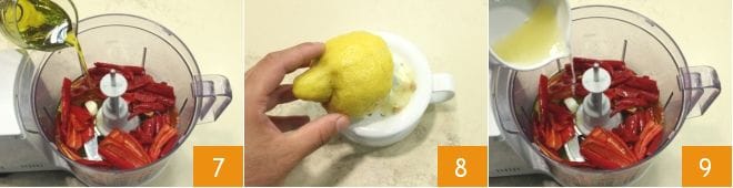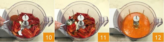 Adicione a páprica doce em pó 10 e o vinagre 11. Neste ponto, ligue o processador por alguns segundos até obter uma mistura densa e homogênea 12, que você deve conservar na geladeira até o momento de utilizá-la.