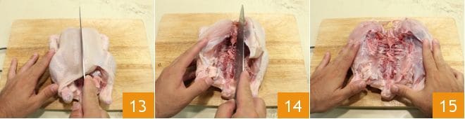 Agora dedique-se ao frango: coloque o frango inteiro não desossado e com pele em uma tábua de cortar e corte-o ao meio, cortando o peito (13-14) e tomando cuidado para não quebrar os ossos, se necessário, você pode realizar essa operação também com uma tesoura de cozinha. Finalmente, tente abrir o frango o máximo possível, ajudando-se com as mãos 15.