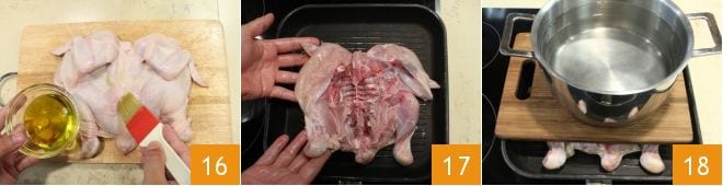 Depois aqueça a chapa e enquanto isso unte a superfície do frango com o azeite de oliva extra virgem 16. Assim que a chapa estiver bem quente, coloque o frango untado sobre ela 17. Para favorecer o cozimento, coloque um peso sobre o frango: aqui foi colocado uma tábua com uma panela cheia de água 18, deixe cozinhar o primeiro lado por cerca de 20 minutos em fogo alto.