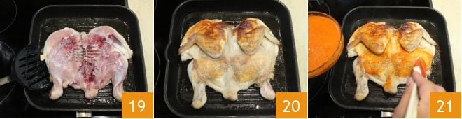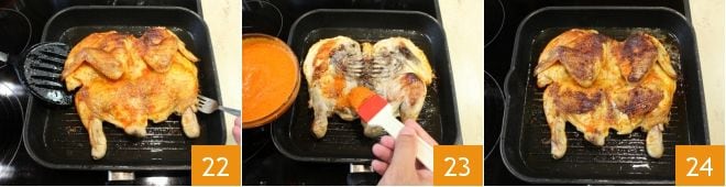 Após esse tempo, vire o frango para o outro lado, ajudando-se com uma espátula (19-20) e cozinhe por mais 20 minutos sempre em fogo alto, sem colocar peso sobre ele. Depois, pegue o molho piri piri que você havia reservado e pincele toda a superfície do frango 21.