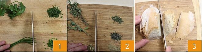 Para preparar as almôndegas aromáticas no vapor, comece picando as ervas aromáticas: pique com uma faca a cebolinha 1, a salsinha, o tomilho, a manjerona e as sementes de funcho 2 e reserve. Pegue o pão amanhecido, retire a crosta 3 e corte a miolo em cubos,