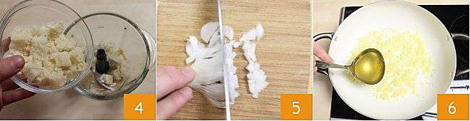 coloque-o em um mixer 4 e triture finamente. Lave a cebolinha, corte o talo e reserve (será usado para aromatizar a água de cozimento), pique o bulbo da cebolinha 5, refogue a cebolinha com uma concha de caldo 6 ou com água até murchar.