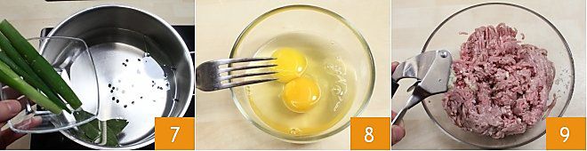 Pegue uma panela equipada com uma cesta de cozimento a vapor grande o suficiente e despeje a água, adicione os aromas: a folha de louro, a pimenta em grãos e o talo da cebolinha que você reservou 7. Bata os ovos em uma tigela 8, adicione sal e pimenta. Em outra tigela, coloque a carne moída e tempere com o alho amassado 9,