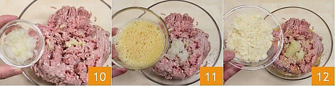 a cebolinha refogada e esfriada 10, os ovos previamente batidos 11 e, por último, o miolo triturado no mixer 12.