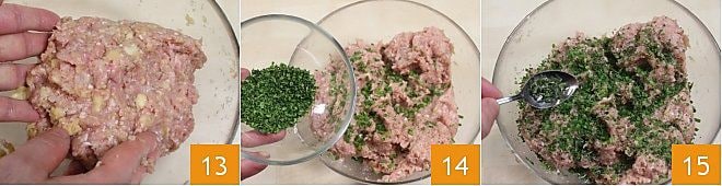 Misture tudo até que a massa esteja homogênea e compacta 13. Agora adicione todas as ervas aromáticas picadas anteriormente: a cebolinha, a salsinha 14, o tomilho, a manjerona 15,