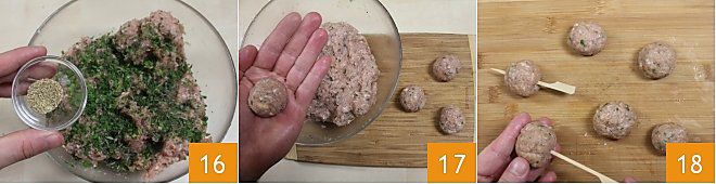 e as sementes de funcho 16. Agora forme as almôndegas: tente obter almôndegas de tamanho mais ou menos igual 17 (com cerca de 20 g cada) para que cozinhem de maneira uniforme. Espete as almôndegas com palitos de dente 18, aqueça a água da panela e espere ferver.
