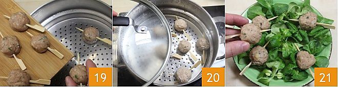 Coloque as almôndegas aromáticas na vaporiera 19 e cozinhe por cerca de 18 minutos cobertas com a tampa 20. (Se desejar, pode cozinhar as almôndegas também no forno: coloque as almôndegas em uma assadeira untada e cozinhe em forno estático por 30 minutos a 180° ou em forno ventilado a 160° por cerca de 25 minutos). Uma vez cozidas, sirva as almôndegas aromáticas no vapor bem quentes; se desejar, pode acompanhá-las com uma salada fresca de agrião 21.