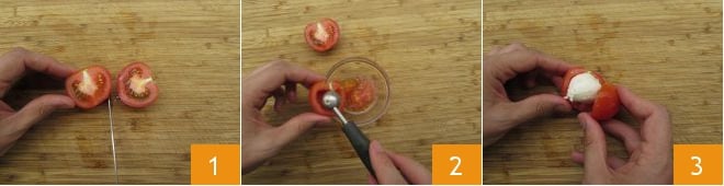 Para preparar as almôndegas caprese, primeiro lave os tomates e seque-os. Corte-os ao meio 1 e, com uma colher pequena, retire a parte da polpa e as sementes internas 2. Coloque no centro de cada tomatinho uma bolinha de mussarela 3.