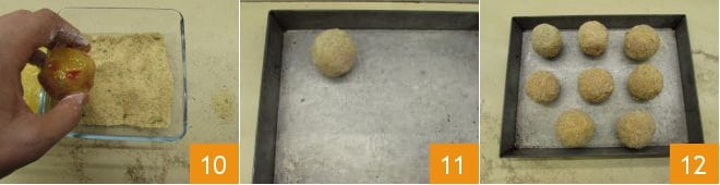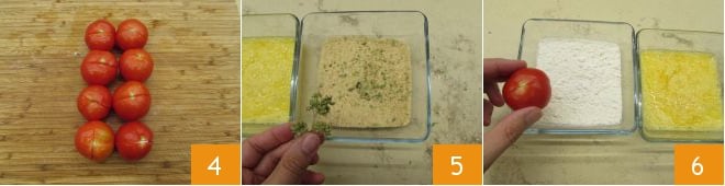 e, por último, na farinha de rosca 10. Disponha em uma bandeja 11 e continue até empanar todos os tomatinhos 12. Neste ponto, despeje o óleo de girassol em uma panela e aqueça até atingir a temperatura de 160 °C.