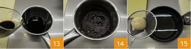Despeje o vinagre balsâmico em uma panelinha 13 e aqueça até obter uma redução 14. Levará cerca de 3 minutos. Quando tiver reduzido pela metade, tire do fogo. Assim que o óleo estiver quente, mergulhe a primeira almôndega 15,