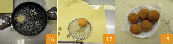 e frite por cerca de 3 minutos 16, até que esteja bem dourada. Você pode fritar poucos pedaços de cada vez, controlando a temperatura do óleo, que não deve baixar. Escorra as almôndegas em um papel toalha para frituras 17 e sirva bem quentes 18, junto com a redução de vinagre balsâmico.