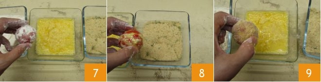 depois no ovo 7, depois na farinha de rosca 8, novamente no ovo 9