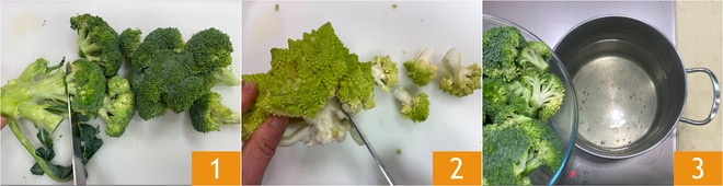 Para preparar as almôndegas de brócolis, primeiro limpe os brócolis: remova as folhas do brócolis verde e separe apenas as flores 1, depois faça o mesmo com o brócolis romanesco 2. Mergulhe todas as flores em uma panela com água fervente 3.