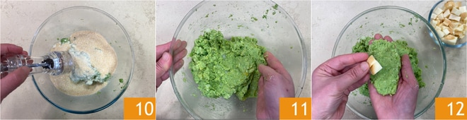 Tempere com sal e pimenta 10, depois misture tudo 11. Pegue um pouco da massa, achate e coloque no centro um cubinho de scamorza 15.