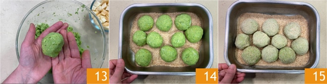 Feche a massa sobre o recheio e forme uma almôndega 16. Repita o mesmo procedimento até que os ingredientes acabem. Role as almôndegas no pão ralado 17 de maneira que fiquem inteiramente cobertas 18.