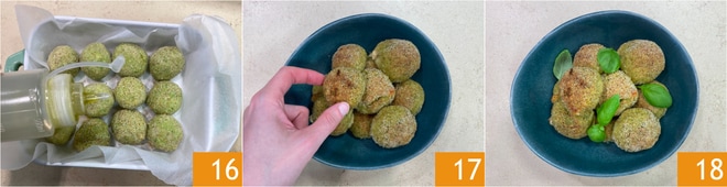 Coloque as almôndegas em uma assadeira forrada com papel manteiga, regue com óleo 19 e asse em forno estático pré-aquecido a 180° por 25 minutos, virando-as na metade do tempo. Emprate 20 e complete com algumas folhas de manjericão. Suas almôndegas de brócolis estão prontas para serem servidas 21!