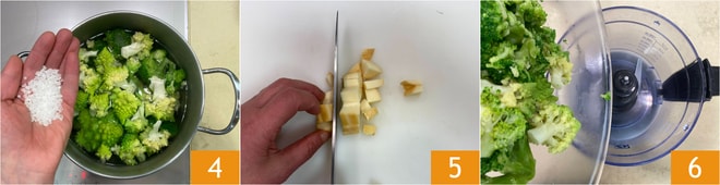 Adicione o sal 4 e cozinhe até que fiquem macias. Enquanto isso, corte a scamorza em cubinhos 5. Escorra os brócolis e transfira-os para um processador de alimentos 6, depois bata até obter uma mistura homogênea.