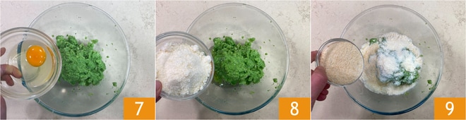Despeje a mistura em uma tigela e adicione o ovo 7, o parmesão ralado 8 e o pão ralado 9.