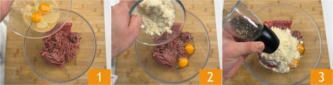 Para preparar as almôndegas na fritadeira a ar, coloque em uma tigela a carne moída de porco e de boi, depois adicione os ovos 1, o Parmigiano Reggiano ralado 2, sal e pimenta 3.