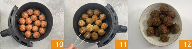 Ponha as almôndegas no cesto da fritadeira a ar (utilizamos uma fritadeira com capacidade de 6 litros) 10 e cozinhe a 200° por 20 minutos, virando-as de vez em quando para um cozimento uniforme 11. Suas almôndegas na fritadeira a ar estão prontas para serem saboreadas 12!