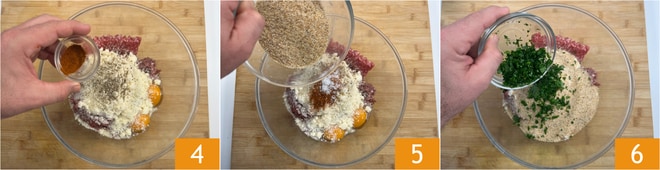 Adicione também a páprica doce 4, a farinha de rosca 5 e a salsinha picada 6.