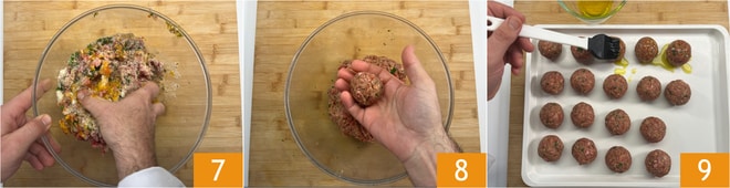 Misture os ingredientes 7 até obter uma mistura homogênea. Cubra a tigela com filme plástico e deixe descansar na geladeira por 30 minutos. Passado esse tempo, retire 50 g de mistura com as mãos úmidas e dê-lhe uma forma redonda 8. À medida que formar as almôndegas, coloque-as em uma bandeja, depois pincele-as bem com óleo 9.